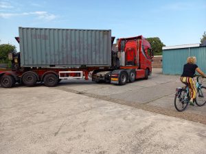 bijna vol was. De container is opgegeven voor transport en opgehaald op 16 september. De verwachte aankomst tijd in Gambia is 1 november dit jaar en na alle douane formaliteiten op transport naar de losplaats bij Boto,s huis , waar vandaan de verdeling van de inhoud plaats vind.
